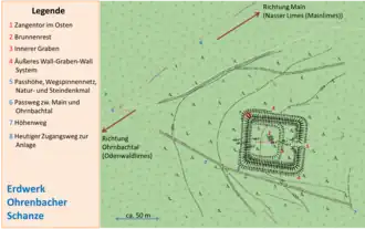 In der Bayerischen Denkmalliste[10] des Bayerischen Landesamtes für Denkmalpflege wird das Objekt unter der Nummer D-6-6220-0003 als nachqualifiziertes Bodendenkmal mit der Bezeichnung Erdwerk „Ohrenbacher Schanze“ spätkaiserzeitlicher oder frühmittelalterlicher Zeitstellung benannt.