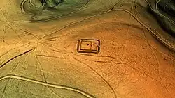 Kastell re. Bildseite: Deutlich ist das Wall-Graben-Wall System der äußeren Umwehrung noch zu sehen.