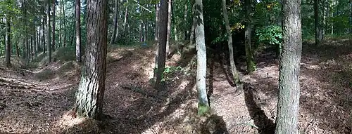 Der noch schwach sichtbare teilende Abschnittsgraben im Innern des Erdwerks (s. Karte Pkt. 3) -