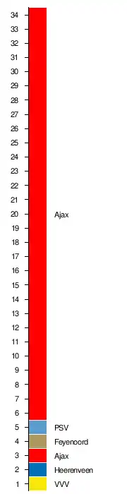 | Ajax Amsterdam | 5:0 | 2:0 | 4:0 | 1:0 | 5:2 | 3:1 | 5:1 | 5:0 | 4:0 | 2:2 | 3:0 | 4:2 | 1:2 | 1:1 | 2:1 | 3:1 | 3:1 | |||