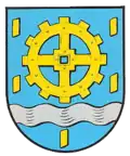 Blasonierung: „In mit goldenen Schindeln bestreutem blauen Feld über gesenktem silbernen Wellenbalken ein schwebendes goldenes Mühlrad.“ |