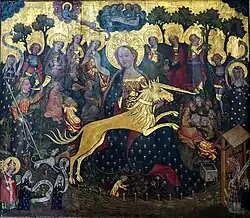 In der Tafel erkennt man das Einhorn, in goldener Farbe vor dem dunkleren Hintergrund abgehoben, im Mittelpunkt auf dem Schoß der Madonna. Nach einer Episode aus dem 17. Kapitel des Physiologos, einer Schrift des 2. Jahrhunderts n. Chr., ließ sich das wilde Tier nur von einer reinen Jungfrau fangen, in dem es sich ihr vertraulich angenähert und seinen Kopf in ihren Schoß gelegt habe.[3] Diese Episode wurde schon früh allegorisch als Hinweis auf Christus ausgelegt: Auch er war im Schoß Mariens empfangen worden und dann später verraten und getötet worden.[3]