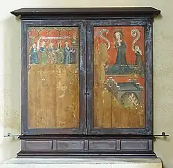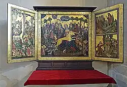 Das sog. Erfurter Einhornretabel, das zwischen 1410 und 1430 entstand,[1] gehört zu den bekanntesten Ausstattungsstücken des Erfurter Doms. Die Mitteltafel des bemalten Altarretabels zeigt die Darstellung einer mystischen Einhornjagd, bei der das Einhorn vom Erzengel Gabriel zum Schoß der hl. Jungfrau Maria gejagt wird. Die Tafel wird flankiert von einer Darstellung der Kreuzigung auf der linken Tafel, den Darstellungen der Höllenfahrt und der Auferstehung Christi auf der rechten Tafel.[2] Der namentlich nicht bekannte Künstler mit dem Notnamen „Meister des Erfurter Einhornaltars“ war wohl in Erfurt ansässig und tätig.[2]