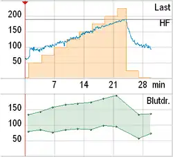 Je nach Untersuchungsziel und Proband sind viele verschiedene Belastungsprotokolle üblich. In der Medizin wird meist eine stufenweise Belastung über neun bis zwölf Minuten entweder nach einem von der WHO oder einem vom Bundesausschuss Leistungssport (BAL) vorgeschlagenen Schema durchgeführt. Zudem gibt es seit 2008 in Österreich ein auf den individuellen Erwartungswert zu berechnendes Protokoll.[4] Die WHO empfiehlt einen Beginn mit 25 oder 50 Watt und eine Steigerung um 25 Watt nach jeweils zwei Minuten, die BAL einen Einstieg mit 50 oder 100 Watt und eine Steigerung um 50 Watt alle drei Minuten. Die maximal zu erreichende Pulsfrequenz wird mit der Formel 220 minus Lebensjahre (Alter) errechnet. Eine Ausbelastung wird bei Erreichen der unteren Standardabweichung (Maximalfrequenz minus ca. 10–12 Schläge pro Minute) angenommen, beispielsweise für einen 60-Jährigen also bei einer Frequenz von etwa 150/min. Bei einer ergometrischen Untersuchung auf dem Laufband wird meist das Bruce-Protokoll angewandt.