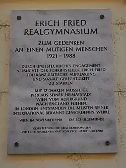 Anlässlich des zehnten Todestages des österreichischen Dichters Erich Fried benannte sich die Schulgemeinde des Bundesrealgymnasiums IX Glasergasse am 19. November 1998 ihm zu Ehren in „Erich Fried Realgymnasium“ um.[1][7] Aus diesem Anlass wurde auf der Außenfassade des Schulgebäudes eine Gedenktafel aus Stein angebracht, sie wurde von der ARGE Bezirksmuseen und dem Erich Fried Realgymnasium gestiftet.[8]