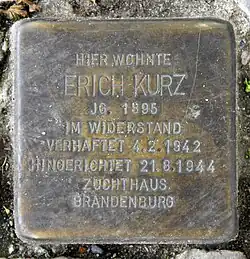 - Am 14. Oktober 2009 wurde vor dem ehemaligen Wohnhaus von Erich Kurz, Rückertstraße 9, in Berlin-Charlottenburg, ein Stolperstein verlegt.