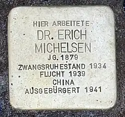 Erich Michelsen wurde daraufhin von der Außenhandelsfirma Otto-Wolf als Ostasienberater eingesetzt. Am 5. Februar 1939 musste er nach China emigrieren und nahm seinen Wohnsitz in Kunming. Seine tatsächliche Ausbürgerung erfolgte dann 1941 nach der Verordnung zum Reichsbürgergesetz.[3] Am 13. März 1948 verstarb Erich Michelsen in Kunming. Aber damit war noch nicht das an ihm begangene Unrecht getilgt. Es vergingen noch weitere fünf Jahre, ehe am 11. Mai 1953 ein Wiedergutmachungsbescheid[4] erlassen wurde. Posthum.