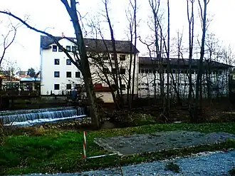 Im Zweiten Weltkrieg fielen am 8. März 1943 auf die Erichmühle zwei Brandbomben, von denen eine am Dach abprallte und ins Wasser fiel, die andere das Dach durchschlug und in dem aufgeschütteten Getreide stecken blieb, ohne zu explodieren.[10] Die hölzerne einspurige Schwarzachbrücke (siehe Bild) wurde 1931 durch einen hochwassersicheren zweispurigen Betonbau ersetzt. 2007 wurde dieser erneuert. Erichmühle wurde immer wieder durch Hochwasserereignisse und Brände stark beschädigt und wiederaufgebaut.[11]