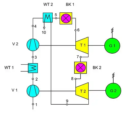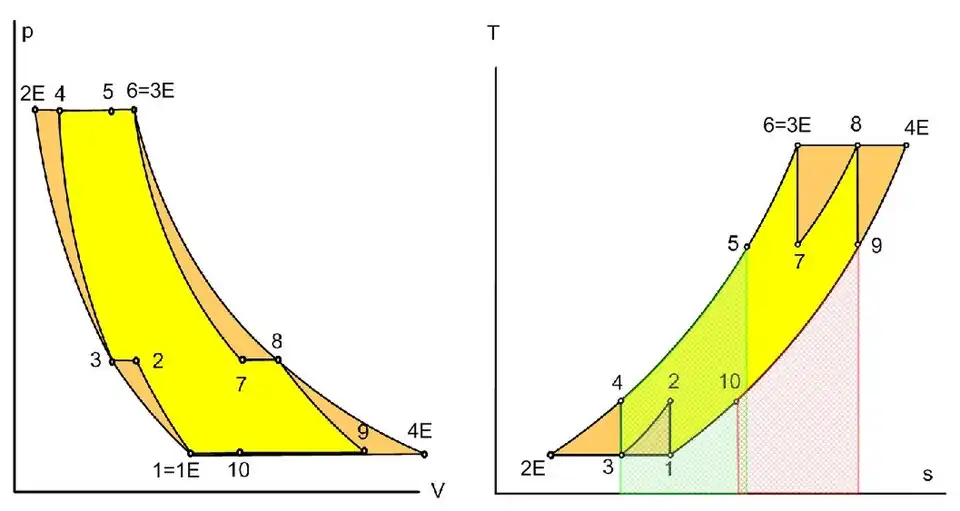 - 2E – 3E: isobare Erwärmung, Wärmezufuhr intern aus dem Abgas der Turbine (4E – 1)