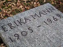 Erika Mann starb am 27. August 1969 im Kantonsspital Zürich an einem Hirntumor. Sie wurde im Familiengrab auf dem Friedhof in Kilchberg beigesetzt. Während der Trauerfeier am 30. August 1969 hielt der Stuttgarter Schriftsteller und Theologe Albrecht Goes die Trauerrede und zitierte Heinrich Heines „Guten Tambour“, dessen „heilige Unruhe“ die Leute aus dem Schlaf trommelt.[40]