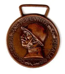 Die aus der Bronze erbeuteter Kanonen gefertigte runde Medaille hat einen Durchmesser von 31 mm und zeigt auf ihrem Avers die nach rechts blickende Kopfbüste des Stifters in Soldatenuniform und Stahlhelm. Umschlossen wird diese Darstellung von der Umschrift GVERRA PER L´VNITA D´ITALIA 1915 1918 (Krieg für die Einigkeit Italiens 1915 1918). Das Revers zeigt die geflügelte Göttin Italia, die auf durch Soldaten emporgehaltenen Schilden steht. Links und rechts der Figur ist die Umschrift CONIATA NEL BRONZO NEMICO (Geprägt in Bronze des Feindes) zu lesen.