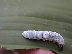 Die Eiraupen beginnen am Rand der Blätter zu fressen und schneiden hier Streifen in das Blatt, die sie nach innen zur Blattmitte hin einrollen. Das zweite und die folgenden drei Raupenstadien sind von einem wachsartigen Staub eingehüllt, was die Raupen vor dem Ertrinken in den Blattrollen während Regen schützt. Die Raupen schwingen heftig hin und her, wenn sie gestört werden und scheiden eine grünliche Flüssigkeit aus. Das Raupenstadium dauert nur 20 bis 30 Tage in Abhängigkeit von der Temperatur. Die Verpuppung erfolgt innerhalb der Blattrolle der erwachsenen Raupe. Das Puppenstadium dauert zwischen acht und zwölf Tagen. Auch die Puppen bewegen sich heftig, wenn sie gestört werden. Die Falter schlüpfen nachmittags.