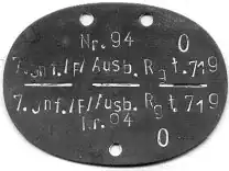Die abgebildete Erkennungsmarke wurde während des Zweiten Weltkriegs an einen Soldaten der Wehrmacht ausgegeben. Die Markierung – 7. Jnf./F / Ausb. Rgt.719 – Nr. 94 0 bedeutet: 7. Kompanie Infanterie Feldausbildungsregiment 719 – Register Nr. 94 – Blutgruppe 0.