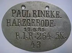 Die abgebildete Erkennungsmarke rechts wurde während des Ersten Weltkriegs an einen Soldaten des Ersten Garde-Regiments ausgegeben. Die Markierung „Anton Stamnitz. Spandau 6.5.95 Ers Batt.1 Gard. Jnf.Leib / K.K.R.1.G.J Nr.455“ bedeutet: „Name: Anton Stamnitz Geboren in Spandau Datum: 6. Mai 1895 im Kombinierten Kavallerie-Regiment der 1. Garde-Infanterie-Division Nr. 455“.