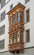 | Greif | Eingeschossiger Erker aus Eichen- und Lindenholz, reichhaltig geschnitzt. Die Reliefs in den Brüstungsfeldern zeigen biblische Motive: Den Streit Jakobs mit Gott (1. Mose 32,24–28 ); Elija am Bach Kerit (1 Kön 17,1–6 ); Die Belehrung Jonas (Jona 4,5–6 ); Tobias auf Reisen (Tobit 6,2–6 ). Zwischen den Brüstungsfeldern Löwen, zwischen den Fenstern Frauenfiguren. | Das genaue Entstehungsdatum ist unbekannt, wahrscheinlich zweite Hälfte 17. Jahrhundert, da der damalige Eigentümer, Caspar Mennhard (1621–1684), ein sehr reicher Mann gewesen sein muss, was aus Steuerlisten hervorgeht.[7] | Gallusstrasse 22 | ![]() |
