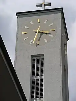 Der Architekt Karl Strobel entwarf einen «betont schlichten Bau, der mit seinem hoch aufragenden Turm einen städtebaulichen Akzent setzt».[11] Über eine hohe Treppe gelangt man zur Stirnwand der Kirche, in die ein grosses Fenster eingelassen ist, welches von drei Kreuzen auf dem Dach überhöht wird. Diese Kreuze symbolisieren den Kalvarienberg und verweisen auf das Patrozinium der Kirche, die Erlösung der Menschheit durch den Kreuzestod Christi. Die drei Eingangsportale stehen für die Trinität.[12]