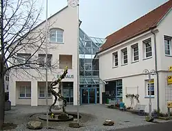 - Das gegenwärtige Rathaus ist ein moderner Zweckbau des späten 20. Jahrhunderts. Vor dem Gebäude befindet sich ein moderner Brunnen, im Gebäude ein historisches Mainzer Rad aus Stein.