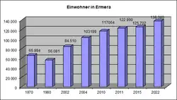 In der Gemeinde leben 137.750 Menschen (2022,[2] 2011: 122.990[10]). Von den Einwohnern sind 70.261 Männer und 67.489 Frauen. Auf 104 Männern kommen 100 Frauen[2] Zwischen 2015 und 2022 lag das jährliche Bevölkerungswachstum bei 1,3 %. Der Landesdurchschnitt liegt bei 1,8 %.[2] Zwischen 1990 und 2004 wuchs die Zahl der Einwohner Ermeras jährlich noch um 2,05 %.[11] 12.546 von ihnen wohnen in einer urbanen Umgebung, 125.204 im ländlichen Teil der Gemeinde.[2]