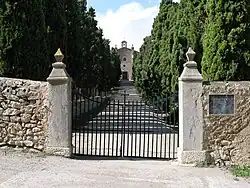 Zum Eingangsbereich der Kapelle führt eine etwa 150 Meter lange Zypressenallee durch die die Gebäude der Ermita umgebenden Gärten des Klosters. Neben und hinter den Klostergärten führen mehrere Trampelpfade zu einem Aussichtspunkt (Mirador) mit Blick über die Badia d’Alcúdia. Vom Tor an der Einfahrt zur Einsiedelei am südöstlichen Ende der Zypressenallee führt ein Weg in Richtung Osten. In einer Entfernung von etwa 300 Metern erreicht man auf ihm die unter hohen Bäumen stehende Quelle sa Font oder Font de s’Ermita. Sie gibt das ganze Jahr hindurch Wasser und wurde zur Bewässerung mehrerer in Terrassen angelegter kleiner Felder genutzt, die der Versorgung der Einsiedelei dienten. Neben der Quelle befindet sich ein Marienheiligtum zu Ehren des Wunders von Lourdes,[2] eine sogenannte Lourdesgrotte.