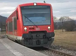 Bis 2022 eingesetzter Dieseltriebwagen Stadler Regio-Shuttle RS 1 am Haltepunkt Bad Urach Wasserfall