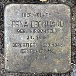 - ↑ Stolperstein-Initiative Eichkamp: Erna Leonhard, Leonor Leonhard. Online. Der Ankunftstag lässt sich bestimmen nach dem Eintrag von Yad Vashem: Transport 36 from Berlin, Berlin (Berlin), City of Berlin, Germany to Auschwitz Birkenau, Extermination Camp, Poland on 12/03/1943.