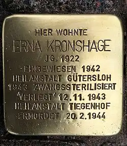Vor dem Geburtshaus von Erna Kronshage in Bielefeld-Sennestadt wurde am 6. Dezember 2012 ein „Stolperstein“ gelegt.