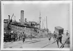Die angekauften Schiffe kamen sofort für Transporte nach Deutsch-Südwestafrika zum Einsatz, wobei die Gertrud Woermann ex Pfalz schon auf ihrer ersten Reise verlorenging.[4] Die Firma Woermann war nicht nur für die Transporte, sondern auch für die Abwicklung an den Landungsplätzen verantwortlich. Im Zuge der Kriegshandlungen wurden auch behelfsmäßige Hafeneinrichtungen in Swakopmund und später auch Lüderitzbucht geschaffen. In der Masse lagen die aus Deutschland ankommenden Schiffe jedoch in See und gaben die Ladung über kleine Fahrzeuge und Flöße an Land. Dies führte zu erhebliche Wartezeiten vor den „Häfen“ und Teile der Ladungen wurden auch zwischen den auf Entladung wartenden Schiffen hin und her geladen, um Schiffe für neue Fahrten frei zu bekommen. Um die gesamte Abwicklung besser steuern zu können, war die Woermann-Linie an einer weitgehend Abwicklung mit eigenen Schiffen interessiert.