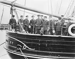 Die National Antarctic Expedition, wie die Discovery-Expedition offiziell bezeichnet wurde, ging auf die Initiative von Sir Clements Markham zurück, dem damaligen Präsidenten der Royal Geographical Society. Die Forschungsreise sollte mit dem Ziel durchgeführt werden, allgemeinwissenschaftliche und geographische Erkundungen in der Antarktis vorzunehmen.[38] Geleitet wurde sie durch den Offizier der Royal Navy Robert Falcon Scott, der erst kurz zuvor zum Commander befördert worden war.[39] Obwohl das Forschungsschiff Discovery nicht zur Royal Navy gehörte, verlangte Scott von der Schiffsmannschaft, den Offizieren und den wissenschaftlichen Expeditionsteilnehmern, sich der in der britischen Kriegsmarine üblichen Disziplin unterzuordnen.[40] Shackleton akzeptierte dies, obwohl er seit Schulzeiten militärischen Drill verabscheute und stattdessen einen zwangloseren Führungsstil bevorzugte.[41] Seine Aufgaben waren wie folgt umrissen: „Verantwortlich für die Untersuchung des Meerwassers, die Versorgung der Offiziersmesse, für den Frachtraum, die Lagerbestände und Versorgungsgüter […] ferner für das Unterhaltungsprogramm.“[42]