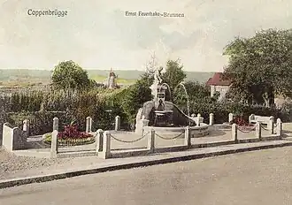 Der Ernst-Feuerhake-Brunnen wurde am 12. August 1908 an der Ecke Schloßstraße/Bahnhofstraße feierlich eingeweiht.[2] Zuvor hatte an dieser Stelle das 1907 abgerissene Coppenbrügger Spritzenhaus gestanden und daneben lag der Steinhauerplatz.[3]