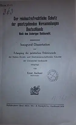 - Der reichsstrafrechtliche Schutz der gesetzgebenden Versammlungen Deutschlands. Greifswald : Adler, 1919. Greifswald, R.- u. staatswiss. Diss. v. 12. Aug. 1919