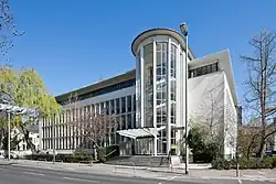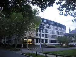 Balser ummantelte er einen älteren Baukern mit einer Stahlbetonkonstruktion, einer Fassade aus Aluminium und Fensterbrüstungen aus flaschengrünem Glas.[7] - 1957: Kreishaus in Trier