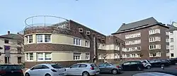 „Neben dem runden Treppenturm waren der reizvolle Kontrast der weißen Wand mit den tiefschwarzen, spiegelnden Fensterbrüstungen aus Gußglas bemerkenswert...“[6] - 1953: Verwaltungsgebäude (Kreishaus) des Landkreises Offenbach in Offenbach am Main, Geleitstraße 124 / Parkstraße (Einweihung 13. Mai 1953)