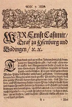 - ↑ Matthias Benad: Toleranz und Ökonomie. Das Patent des Grafen Ernst Casimir von 1712 und die Gründung der Büdinger Vorstadt. Büdinger Geschichtsblätter, Bd. XI, 1983, S. 163–197.