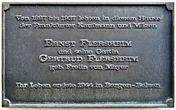 - ↑ Gedenktafel für Ernst und Gertrud Flersheim, Myliusstraße 32. In: Institut für Stadtgeschichte Frankfurt am Main, auf: frankfurt1933-1945.de