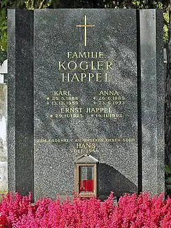 Ernst Happel ruht in einem ehrenhalber gewidmeten Grab auf dem Hernalser Friedhof (Gruppe 1, Nummer 238) in Wien.[31] Dies ist gleichzeitig das Familiengrab seiner Ehefrau Elfriede (geborene Kogler; * 29. April 1924; † 29. Juli 1996), die Happel 1952 geheiratet hatte und mit der er 1953 den Sohn Ernst bekam.[32][33]