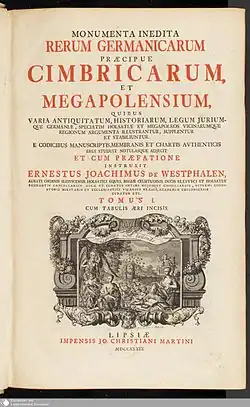 - Monumenta inedita rerum Germanicarum praecipue Cimbricarum et Megapolensium. Vier Foliobände, Leipzig 1739–45