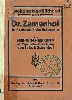 - als Heinrich Nienkamp: Dr. Zamenhof, der Schöpfer des Esperanto. Kun Esperanta traduko de Jakob Schenkel. (Zweisprachige Bücherei 1.) Dresden: Ader & Borel, 1917.