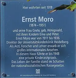- ↑ Webseite Universitätsklinikum Heidelberg: Gedenktafel Ernst Moro enthüllt ( des vom 28. Februar 2017 im Internet Archive) Info: Der Archivlink wurde automatisch eingesetzt und noch nicht geprüft. Bitte prüfe Original- und Archivlink gemäß Anleitung und entferne dann diesen Hinweis., abgerufen am 27. Februar 2017.