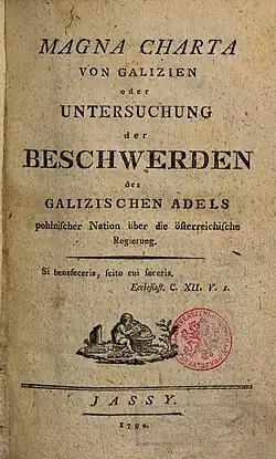 - Magna Charta von Galicien oder Untersuchung der Beschwerden des galicischen Adels pohlnischer Nation über die oesterreichische Regierung, Lemberg 1790 (im Verlag der Raspeschen Buchhandlung), (online)