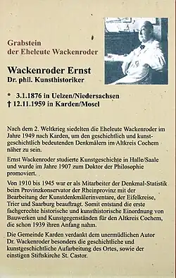 Ernst Wackenroder ist auf dem Friedhof von Karden am alten Kirchturm beerdigt. Eine Gedenktafel erinnert an sein Werk.