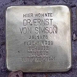 1937 wurde Ernst von Simson zur Niederlegung seiner Ämter gezwungen. Im folgenden Jahr emigrierte er nach Großbritannien, wo er seine unvollendet gebliebenen Lebenserinnerungen verfasste. Von Simson besaß eine Bibliothek von ca. 4000 Bänden, die er in Deutschland zurücklassen musste. Ein Band aus dieser Bibliothek tauchte später in der Privatbibliothek von Martin Bormann auf.[3]