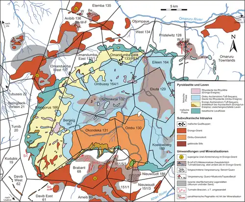 - ↑ a b c d e f Franco Pirajno: Geology, geochemistry and mineralisation of the Erongo Volcanic Complex, Namibia. In: South African Journal of Geology. 93 (Heft 3), 1990, S. 485–504.