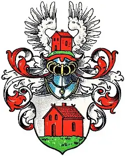 Blasonierung: In Silber auf grünem Rasen ein rotes Haus. Auf dem Helm das Haus zwischen einem offenen silbernen Flug. Die Helmdecken sind rot-silbern.[15]