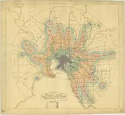 Erreichbarkeitskarten finden z. B. auch im Bereich des öffentlichen Personennahverkehrs Einsatz („travel time maps“ bzw. Reisezeitkarten oder Isochronenkarten), insbesondere zur Beurteilung von Verbindungs- und Reisemöglichkeiten (s. Abbildung).[2]