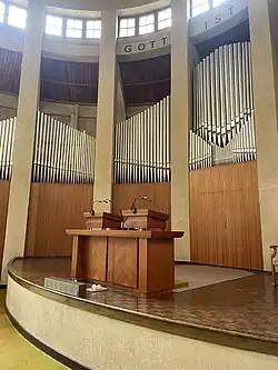 Das Gebäude an der Straße enthält einen Lesesaal, einen großen Raum für die Sonntagsschule und Räume für die Verwaltung. Auf dem rückwärtigen Grundstück befindet sich eine Hallenkirche auf parabelförmigem Grundriss. Innen sichtbar, direkt unter dem Satteldach und der halben Kugelkalotte über der Apsis befindet sich eine hölzerne Decke. Durch den umlaufenden Gang und die Obergaden wirkt das Kirchenschiff wie eine Basilika. Der Saal wird zusätzlich durch Fensterbänder im Umgang oberhalb der holzverkleideten Wände erhellt. In der annähernd halbrunden Apsis befindet sich ein Podest, auf dem für die beiden Vorleser der Predigt eine gemeinsame Kanzel steht. Das Kirchengestühl ist nach hinten leicht steigend angeordnet. Über der Holzverkleidung auf dem Umgang der Apsis, hinter dem Orgelprospekt, befindet sich die Orgel mit hölzernen Orgelpfeifen, der Spieltisch steht neben dem Podest. Weitere Sitzplätze sind auf einer Empore über dem Vorraum vorhanden.
