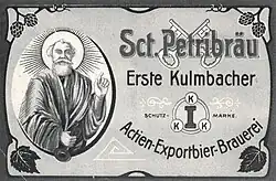 Im Jahre 1906 stellte EKU auch Flaschenbier her, nachdem bisher Bier nur in Fässern ausgeliefert wurde. In kurzen Abständen folgten die anderen Brauereien in Kulmbach. 1910 kam es zu weiteren staatlichen Auflagen. Das bayerische Staatsministerium des Innern ordnete an, dass der Abstand des Füllstriches vom oberen Rand des Bierglases zwei bis vier Zentimeter betragen muss. Dies war ein Erfolg der gegen schlechtes Einschenken meuternden Biertrinker.[4]
