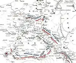 Die Verteidigung von Paris war seit 25. August dem Kommando von General Joseph Gallieni unterstellt; die Regierung unter Präsident Raymond Poincaré hatte ihren Sitz am 2. September nach Bordeaux verlegt. Seit 27. August rückte Generaloberst von Kluck mit seiner 1. Armee östlich von Paris nach Süden vor; diese Bewegung wurde vom deutschen Hauptquartier in Anerkennung der Lage nachträglich gebilligt. Am 3. September 1914 beobachteten französische Aufklärungsflugzeuge, dass die 1. Armee ihre Marschrichtung änderte und nun auf Paris zuhielt.[4] Das brachte Joffre dazu, seine neue Gegenoffensive an der Marne auszuführen. Die in Luxemburg stationierte Oberste Heeresleitung verlor inzwischen den Überblick über die operative Lage, vor allem fehlte jegliche Fernsprechverbindung zum bedrohten rechten Flügel. Der technisch unzureichende Funkverkehr konnte dies nicht wettmachen, die Fliegermeldungen blieben oft ungenutzt. Die 1. Armee versuchte mit Gewaltmärschen doch noch die britische Expeditionsarmee einzuschließen und vernachlässigte dabei den Flankenschutz des gesamten deutschen Vorstoßes gegenüber dem westlich liegengelassenen Paris, sie hatte unter schweren Kämpfen über 500 Kilometer zurückgelegt.[5]