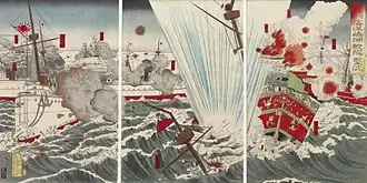 Am 17. September 1894 kam es zur Seeschlacht am Yalu, als japanische Kreuzer die größere chinesische Beiyang-Flotte nahe der Mündung des Flusses Yalu stellten. Die Japaner versenkten acht der zwölf chinesischen Kriegsschiffe und sicherten sich somit die Seeherrschaft im Gelben Meer. Die Chinesen schafften es allerdings, 4.500 Soldaten an der Yalu-Mündung anzulanden. Die Seeschlacht am Yalu war die größte Seeschlacht des Krieges und ein großer Propagandasieg der Japaner.[23]