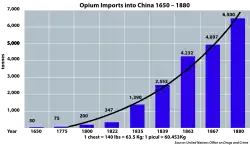 Das von der britischen Ostindienkompanie unter ihrem Produktionsmonopol in Bengalen hergestellte Patna-Opium war qualitativ hochwertiger als das einheimisch produzierte Rauschmittel. Die Kompanie überließ aufgrund der Illegalität in China die Verschiffung ab Indien privaten Händlern, um ihre legalen Geschäfte im Rahmen des Chinahandels in Kanton nicht zu gefährden. Diese gaben ihre Ware vor der Küste an chinesische Schmuggler weiter. Zunächst von den Schiffen, später von einem Depot der Kompanie auf der Insel Lintin wurde das Opium mit flachgehenden Ruderbooten mit Hilfssegeln und jeweils 50 bis 60 Mann Besatzung ins Landesinnere verbracht. Man schätzte 1831, dass etwa 100 bis 200 Boote dieses Geschäft betrieben.[15] Die Ostindienkompanie erhielt jedoch Konkurrenz von Produzenten aus den Fürstenstaaten, für deren Malwa-Opium das Produktionsmonopol nicht galt. Die Gesellschaft versuchte die Produzenten aus den Fürstenstaaten mittels Expansion ihrer eigenen Produktion aus dem Markt zu drücken und steigerte die Produktion in Bengalen immer mehr. US-amerikanische Händler nahmen mit rund 8 % Marktanteil 1820 mit Opium aus dem Osmanischen Reich eine Nebenrolle ein. 1823 löste Opium Baumwolle als Topimport des Kaiserreichs ab.[16] Von 1805 bis 1839 hatte sich die Menge des von der Ostindienkompanie nach China exportierten Opiums von 3159 Kisten auf 40200 Kisten mehr als verzehnfacht, dabei wirkte das von der britischen Regierung 1833 aufgehobene Teehandelsmonopol als Katalysator für die Zunahme der Beteiligung unabhängiger Kaufleute und eine Vermehrung des Handelsvolumens. Das als Opiumschwemme wahrgenommene erweiterte Angebot auf den chinesischen Märkten führte zu einem Preisverfall und zur raschen Ausbreitung des Konsums in niederen sozialen Schichten und Regionen außerhalb Südchinas.[17]