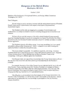 Pelosi veröffentlichte am 22. Oktober ein vierseitiges Informationsblatt, das mit Zitaten des Telefonats und der Whistleblower-Beschwerde als Beweise die Anschuldigungen gegen Trump auflistete und darlegte, wie der Präsident seinen Amtseid, die nationale Sicherheit und die Integrität der Wahlen für seinen persönlichen Vorteil verraten habe.[42]